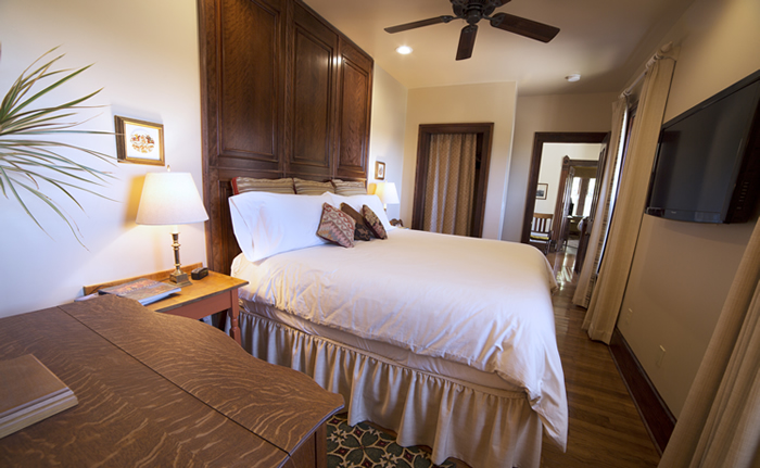 The Blair Room is our newest room and has its own unique characteristics. Six pantry doors, recovered from the Hippodrome Theatre, have been repurposed in a creative, unique and stunning way as the headboard of the king size bed. This inviting king size bed features a firm Stearns and Foster mattress with a plush pillow top. Luxurious high quality bed linens have become a trademark at Wallace Manor.