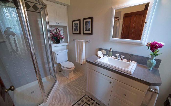The attached private bathroom features a heated tile floor with a period “tile rug.” A tiled shower stall and quality fixtures adorn this room.