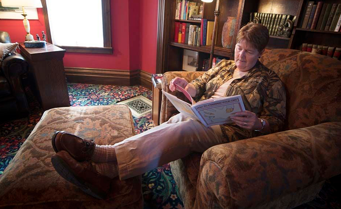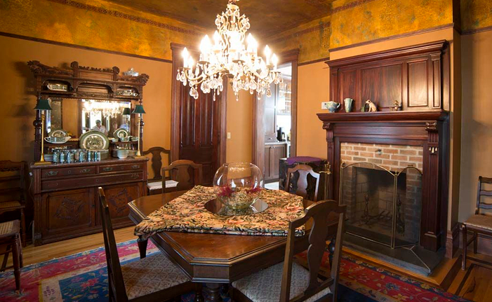 The Lady's Parlor, with its original fireplace mantle, is a smaller more intimate space that is furnished with plush overstuffed furniture to provide a comfortable space for conversation or to curl up with a book. Your host proudly displays period photographs of his ancestors in this room.