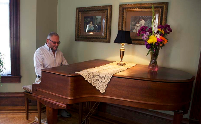 The Men's Parlor, with its original fireplace mantle includes period furnishings and a baby grand piano. Our guests are free to tinkle the keys (hopefully not to the annoyance of our other guests).